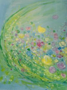 それを絵にしました。たくさんの愛のやさしい美しいたまが無限に浮かんで飛んでいる感じにしました。描いても描いても、さらにたくさんたくさん描きたくなりました。